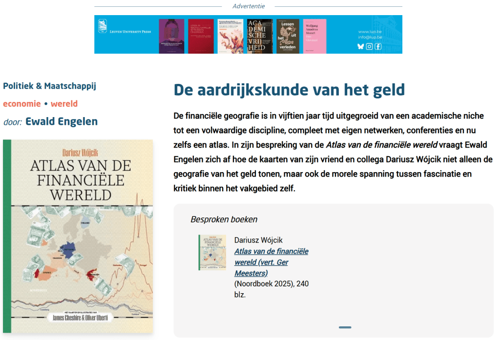 De financiële geografie is in vijftien jaar tijd uitgegroeid van een academische niche tot een volwaardige discipline, compleet met eigen netwerken, conferenties en nu zelfs een atlas. In zijn bespreking van de Atlas van de financiële wereld vraagt Ewald Engelen zich af hoe de kaarten van zijn vriend en collega Dariusz Wójcik niet alleen de geografie van het geld tonen, maar ook de morele spanning tussen fascinatie en kritiek binnen het vakgebied zelf.